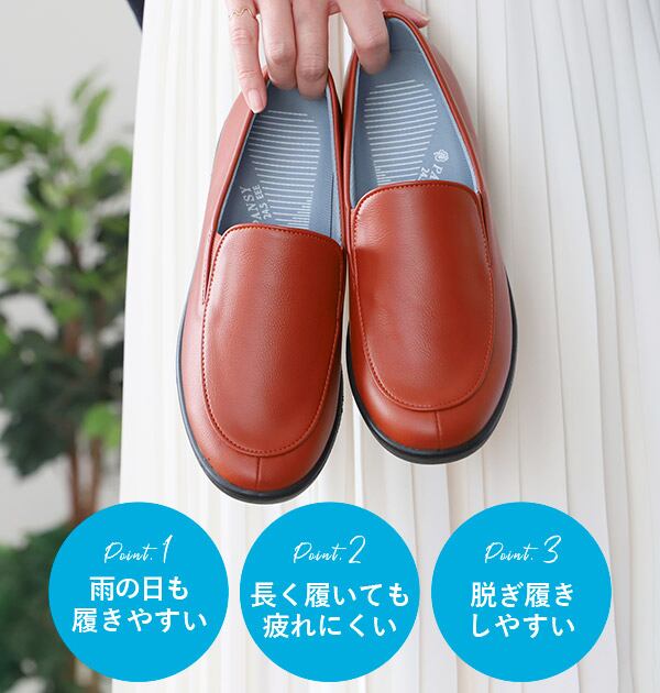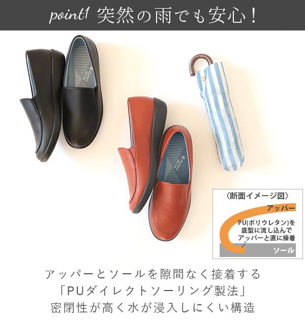 軽量で歩きやすい、レディースのスリッポンです。生活防水でちょっとした雨でも気軽にはけるのが嬉しい☆また、サイドにゴムがあるので履きやすく曲がりやすいので歩くのが楽です。立体のカップインソールが足にしっかりフィット。ソールには滑りにくいゴム素材が2か所あり、凹凸で地面をしっかりグリップ。紐がないので履きやすいスリッポンです。