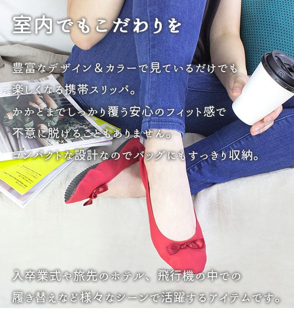 プリエ バトュ(plierbattu)の大人かわいい軽量・携帯スリッポンです。バッグに入れてもかさばらない、コンパクトなサイズ感で、使わない時には半分に折りたたんで、付属のポーチにINできるのが嬉しいポイント!ポーチを広げれば大き目サイズのトートバッグ変身!履いてきた靴をそのまま収納できます。入学式や授業参観などの学校行事や、オフィスなどいろいろなシーンで活用できるアイテムです。