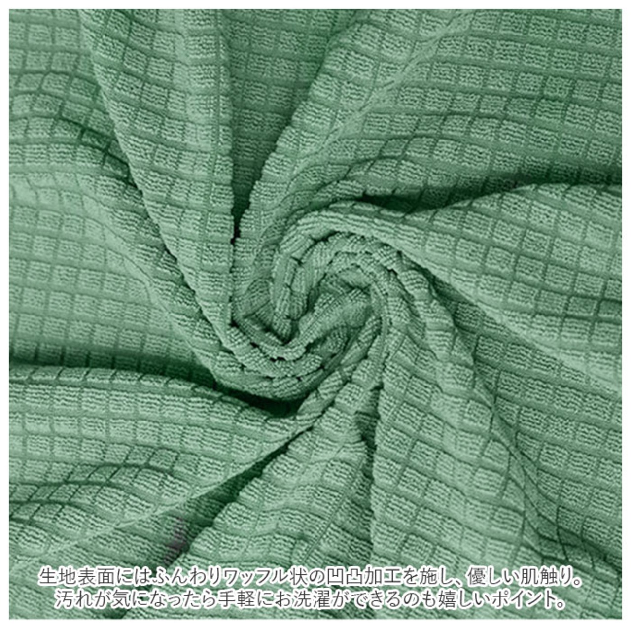 ・生地表面にはふんわりワッフル状の凹凸加工を施し、優しい肌触り。汚れが気になったら手軽にお洗濯ができるのも嬉しいポイント。