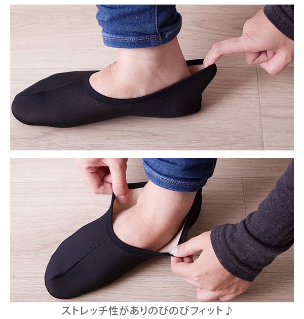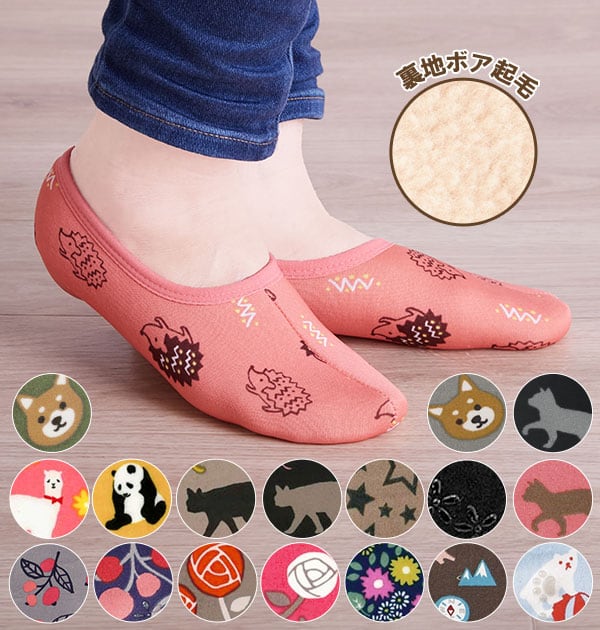 当店でも取り扱いのあるぽかぽかシリーズのルームシューズ、ぽかぽかソックスです。ソックスの中がボアの起毛になっており、ストレッチ性抜群の表地とセットになった、履きやすくあったかいソックス。足にフィットして熱を逃がさない作りです。