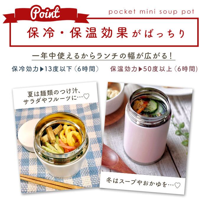 ・保温効力/50度以上(6時間)保冷効力/13度以下(6時間)と、小さいのに保温・保冷効果もばっちり!