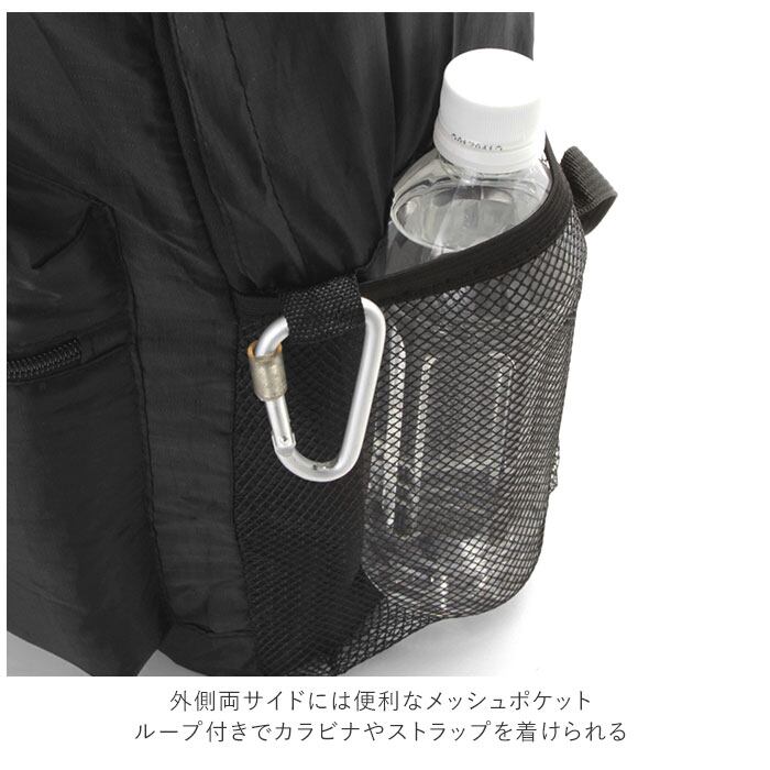 ・外側両サイドには、500mlペットボトルや折りたたみ傘を入れておくのにちょうどいいメッシュポケット。メッシュ素材なので、汗拭きタオルを収納してもムレないので、アウトドアでも活躍。