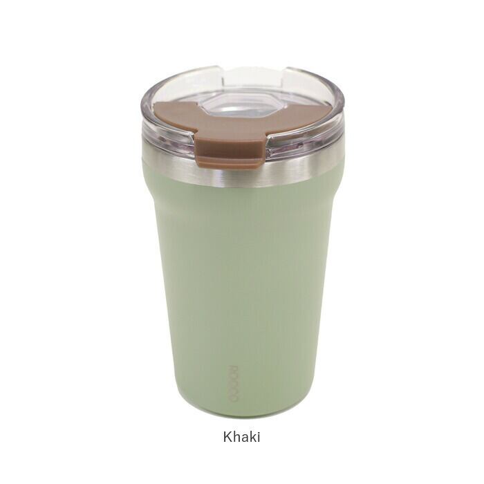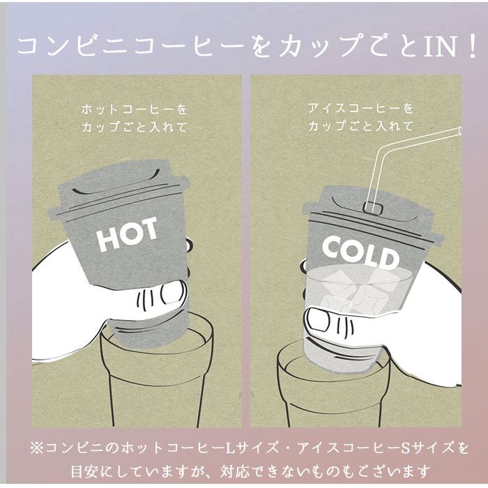・コンビニやショップで買った飲みものをカップごと入れられる、ステンレス製のフタ付きタンブラー。(※コンビニのホットコーヒーLサイズ・アイスコーヒーSサイズを目安にしていますが、対応できないものもございます。)