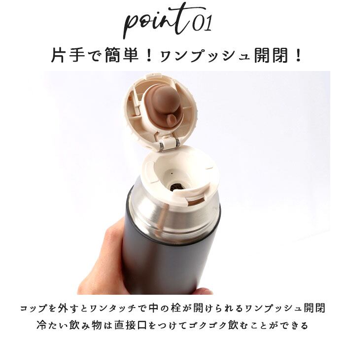 ・コップを外すとワンタッチで中の栓が開けられるワンプッシュ開閉!冷たい飲み物は直接口をつけてゴクゴク飲むことができる。