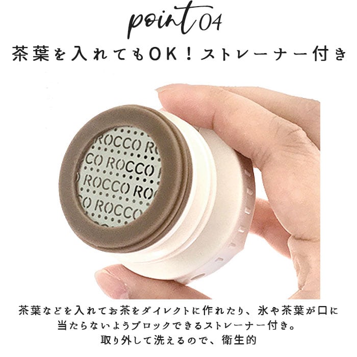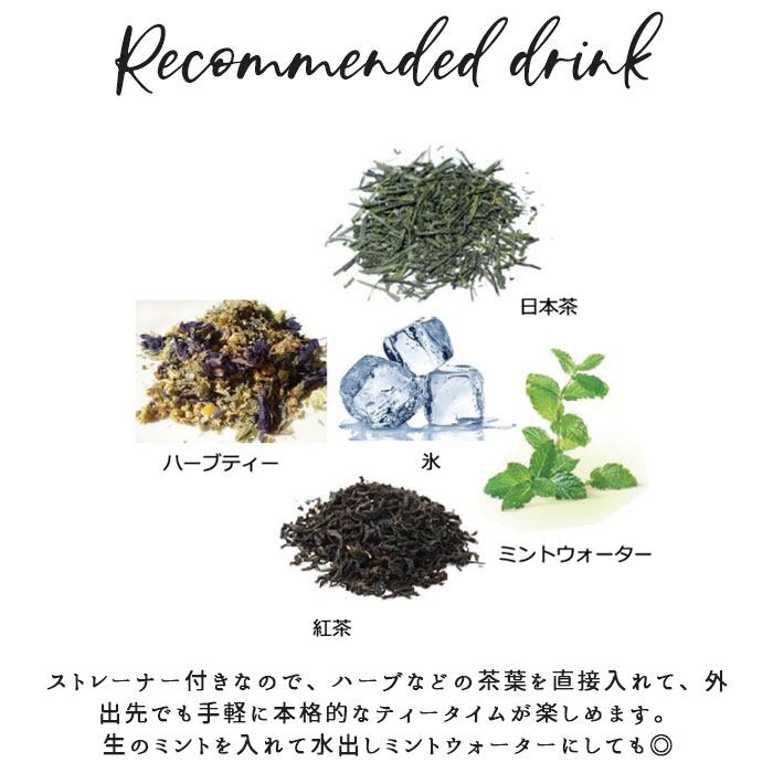 ・茶葉などを入れてお茶をダイレクトに作れたり、氷や茶葉が口に当たらないようブロックできるストレーナー付き。取り外して洗えるので、衛生的。