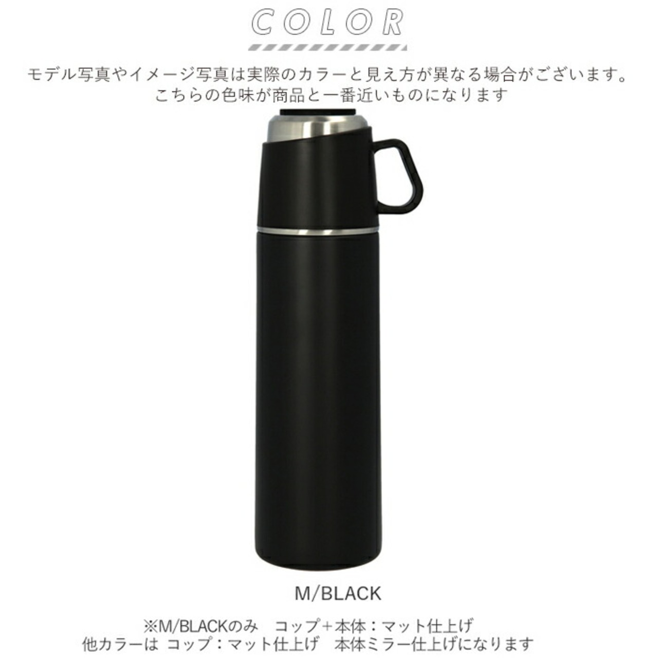 [M/BLACK]のカラーのみ、「コップ+本体:マット仕上げ」。他のカラーは「コップ:マット仕上げ、本体:ミラー仕上げになります。