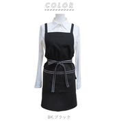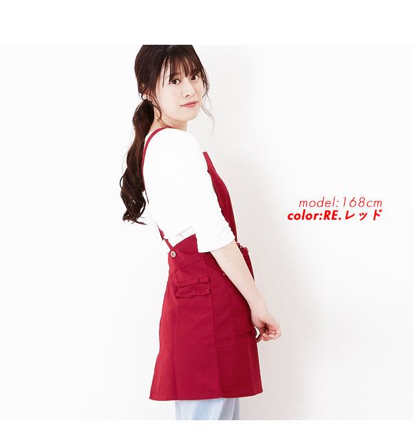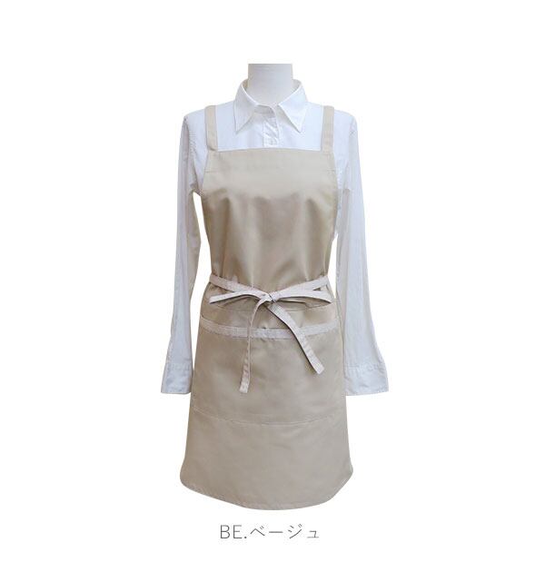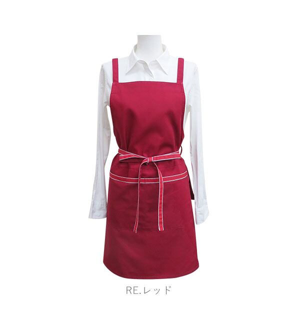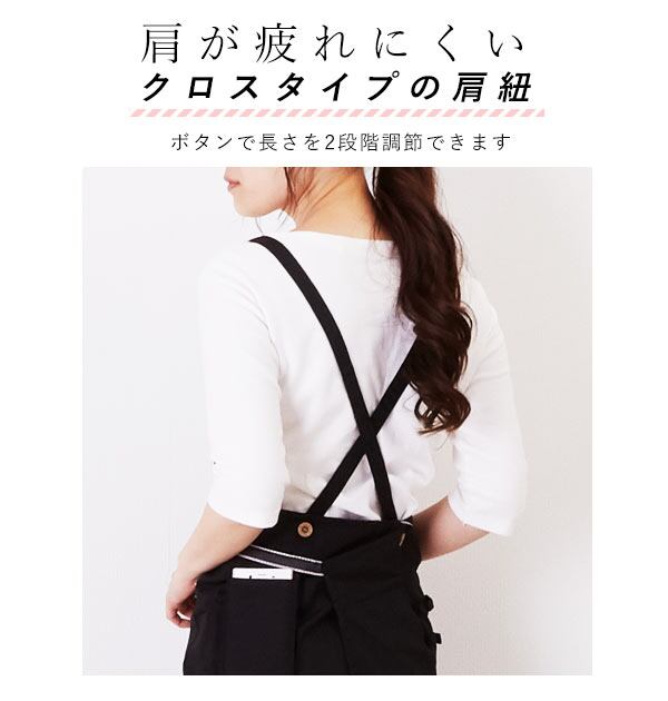 しっかりして使いやすい、ショートワークエプロンです。前面には大きめポケットと、左脇にミニポケット、右脇にはペンなどをさしておけるループが付いています。肩紐はボタンで調整できるようになっており、腰紐はフロントで結ぶタイプ。前面ポケットフチと腰紐には、アクセントでかわいいステッチが入っています。
