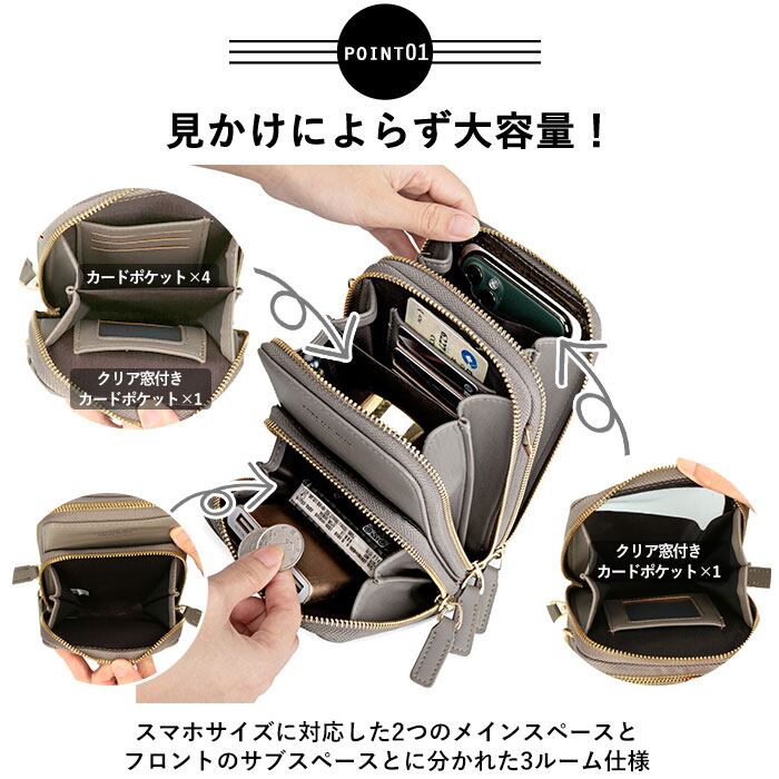 ・背面側メインルームには、スマホが収納できるオープンポケット×1とカードポケット×1を装備。ポーチ背面の大きなクリア窓を指でなぞれば、ポーチ外側からスマホをラクラク操作できるのが嬉しいポイント!