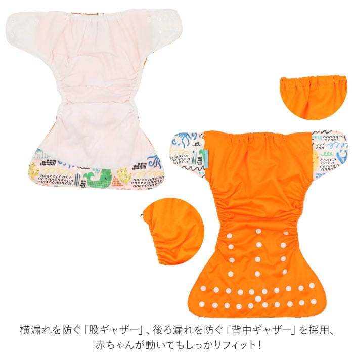 ・横漏れを防ぐ「股ギャザー」、後ろ漏れを防ぐ「背中ギャザー」を採用しているので、赤ちゃんが動いてもしっかりフィット!