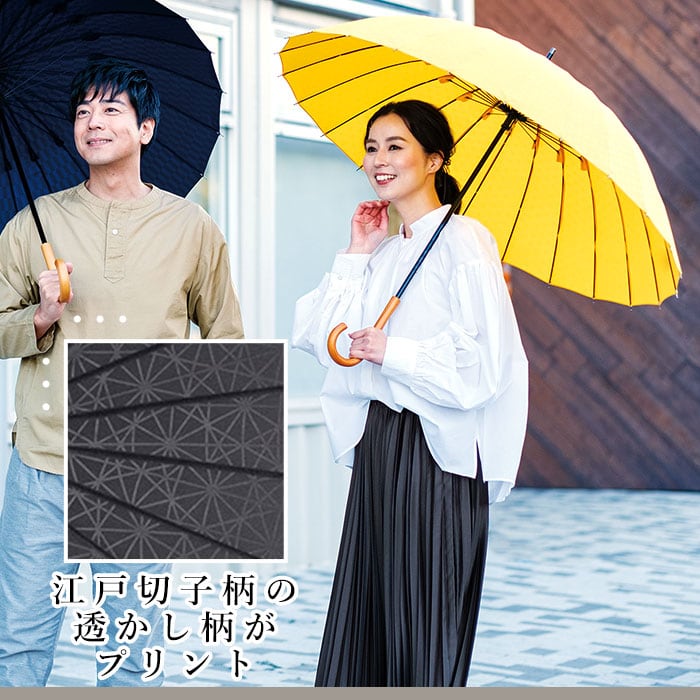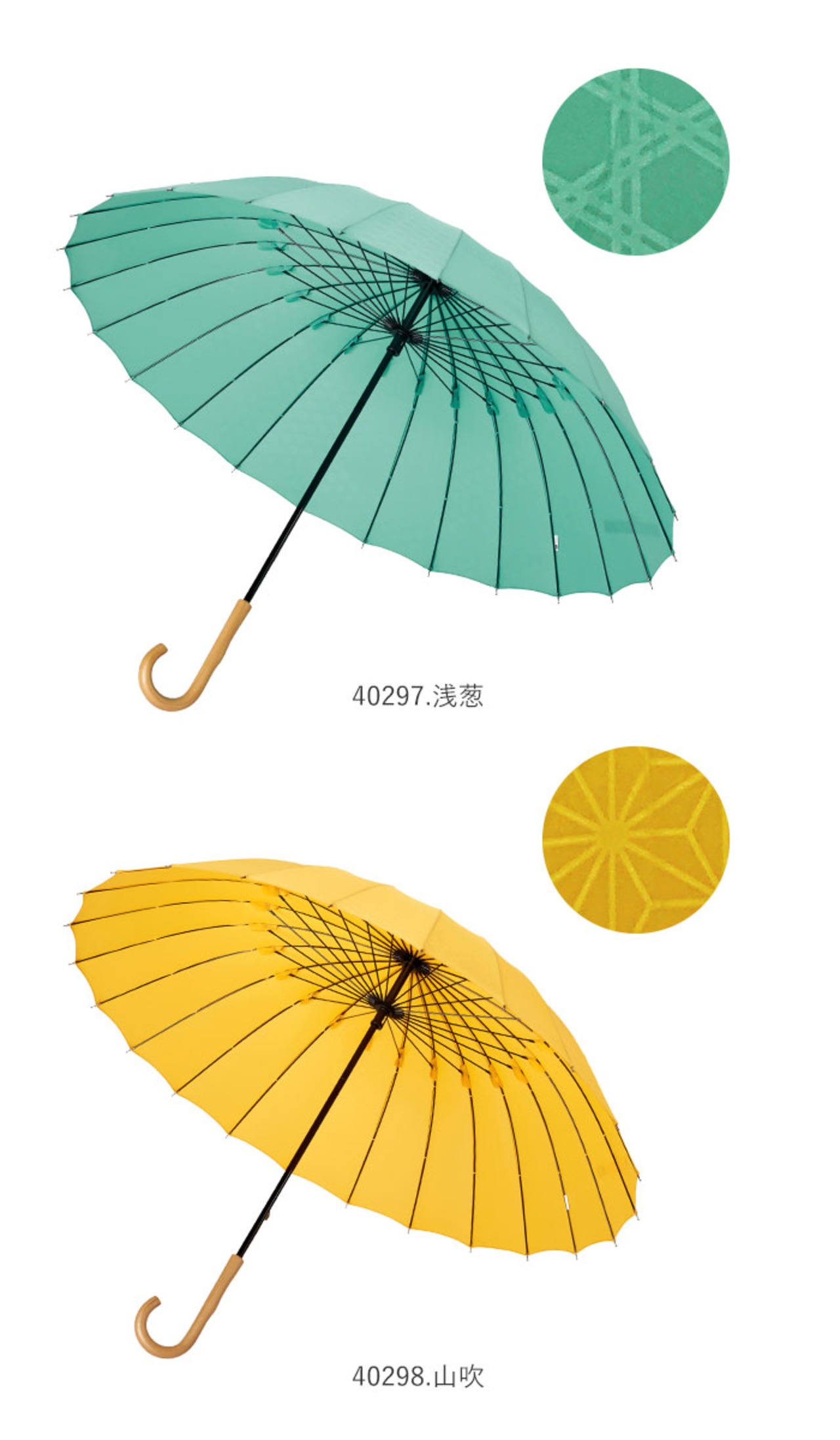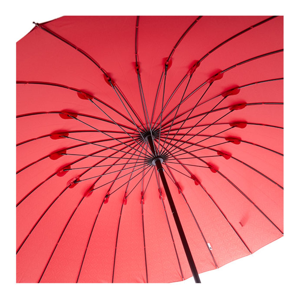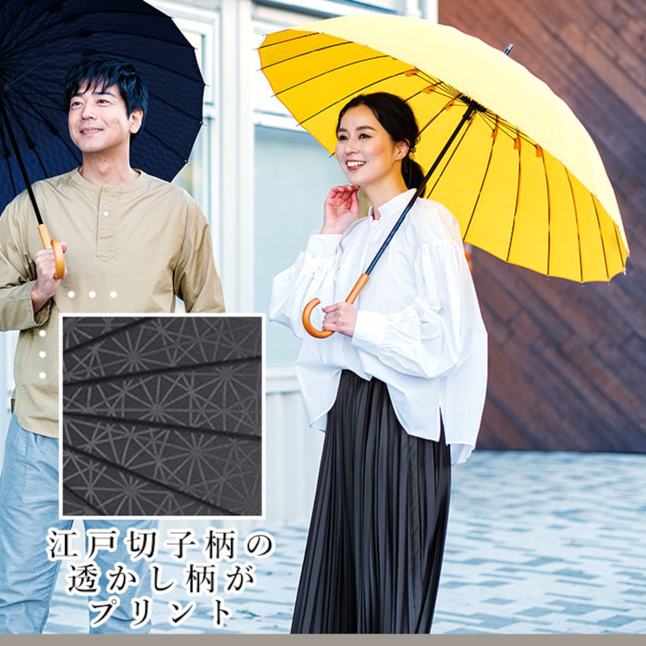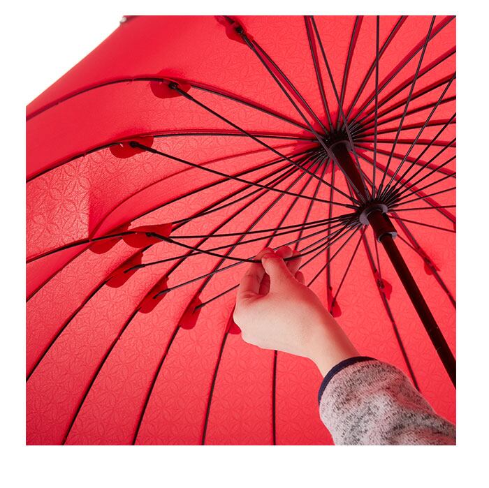 晴れの日も雨の日も快適に過ごしていくために、レイングッズの機能性とデザインにこだわったシリーズ「mabu」より、モダンな和風デザインの24本骨アンブレラ「江戸」が登場しました。江戸切子柄の透かし柄がプリントされた傘生地と、傘を開いた時の丸みの帯びたフォルムが、雨の日のお出かけをスタイリッシュに彩ります。高級感のある木調ハンドルや、傘生地のカラーにも紅、草、墨といった日本伝統色を取り入れ、細部にまでこだわっています。