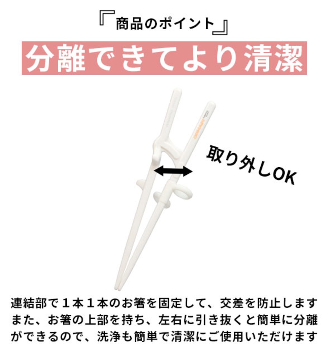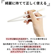 お箸のきれいな持ち方、正しい使い方を練習出来るエジソンのお箸。リングに指を入れることで正しく持てる設計になっており、リングは正しい指の角度をサポート。連結されているのでお箸が苦手な方でも練習しやすく、3つのステップで一般のお箸に移行できる仕組みになっています。