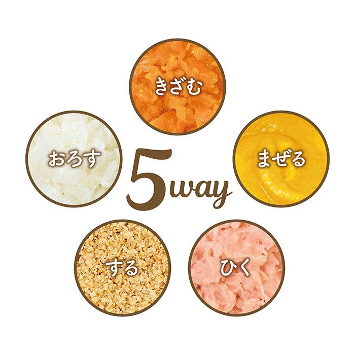 1つのアタッチメントで「きざむ・おろす・まぜる・する・ひく」が可能。1台5役の優れもの◎