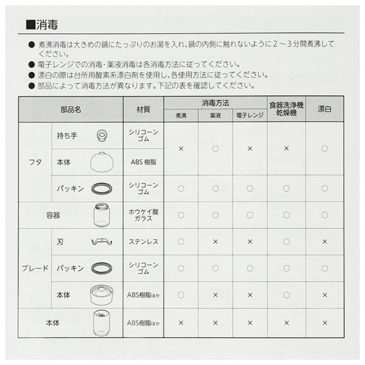 ・容器、ブレードは家庭用の食洗機対応&煮沸消毒OK。