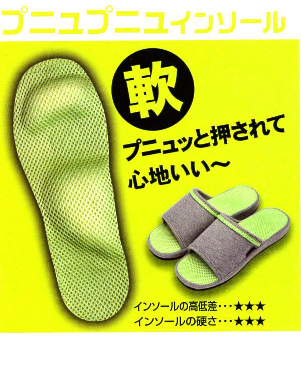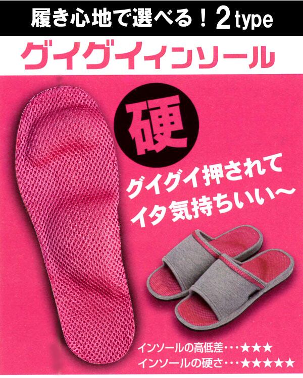 青竹踏みのように大きく隆起したインソールで足裏のコリをほぐして、血行を促進します。歩くたびにあなたの足をリフレッシュ♪お好みに合わせて、硬さの違う2種類からお選びください。