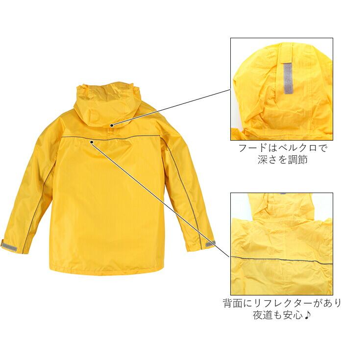 ・背面から左右の袖にかけて、安全性を高めるリフレクター素材のライン付き。薄暗い雨の日でも、背後からすれ違う車から認識されやすくなり、ママパパも安心。