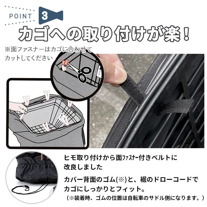 ・カバー背面のゴム(※)と、裾のドローコードで、カゴにしっかりとフィット。(※装着時、ゴムの位置は自転車のサドル側になります。)