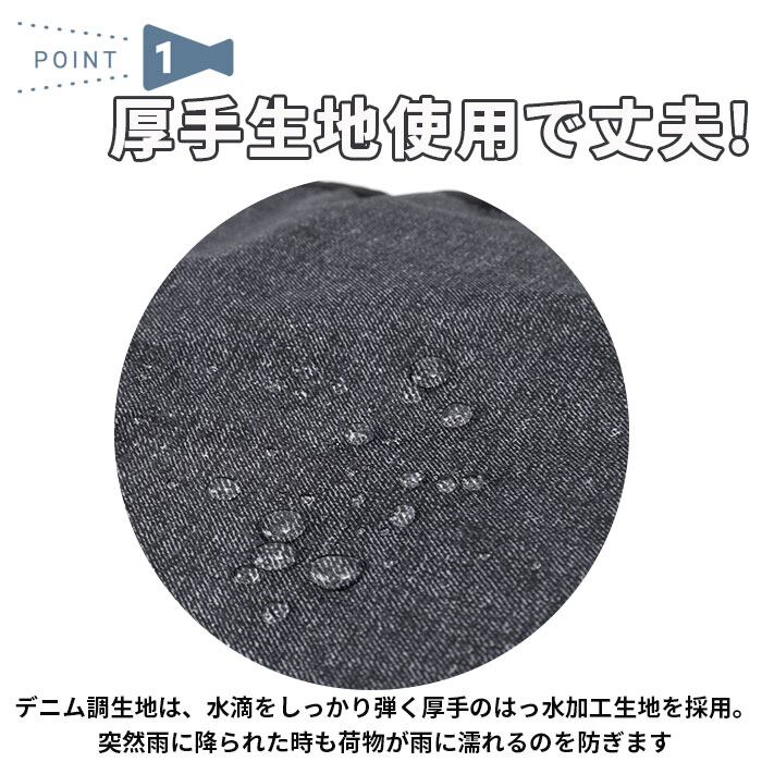 ・スタイリッシュなデニム調生地には、水滴をしっかり弾く厚手のはっ水加工生地を採用。突然雨に降られた時も荷物が雨に濡れるのを防ぎ、帰宅後にタオルでサッと拭くだけでお手入れも簡単!