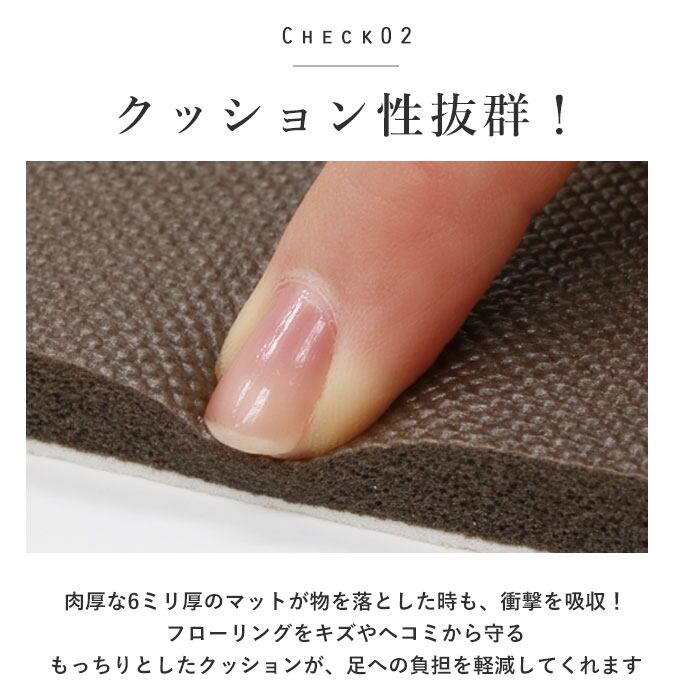 ・厚さ6mmのもっちりとしたクッションが、足への負担を軽減。うっかり物を落としてしまっても衝撃を吸収。