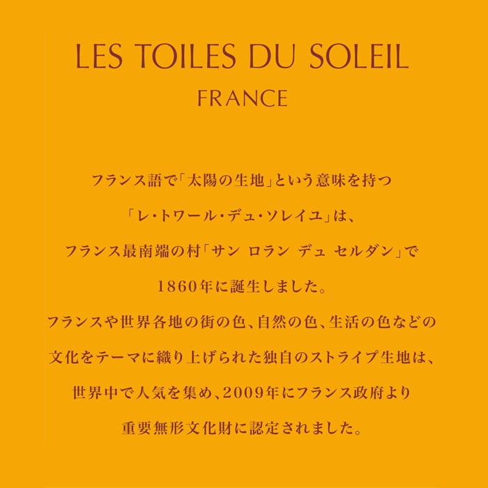 ・「レ・トワール・デュ・ソレイユ」とは、フランス語で「太陽の生地」という意味。フランスや世界各地の街の色、自然の色、生活の色などの文化をテーマに織り上げられた独自のストライプ生地は、世界中で人気を集め、重要無形文化財に認定。