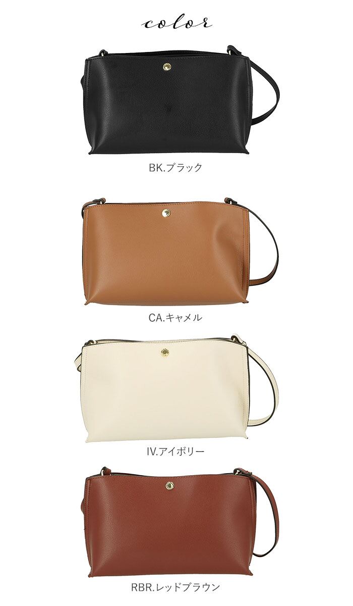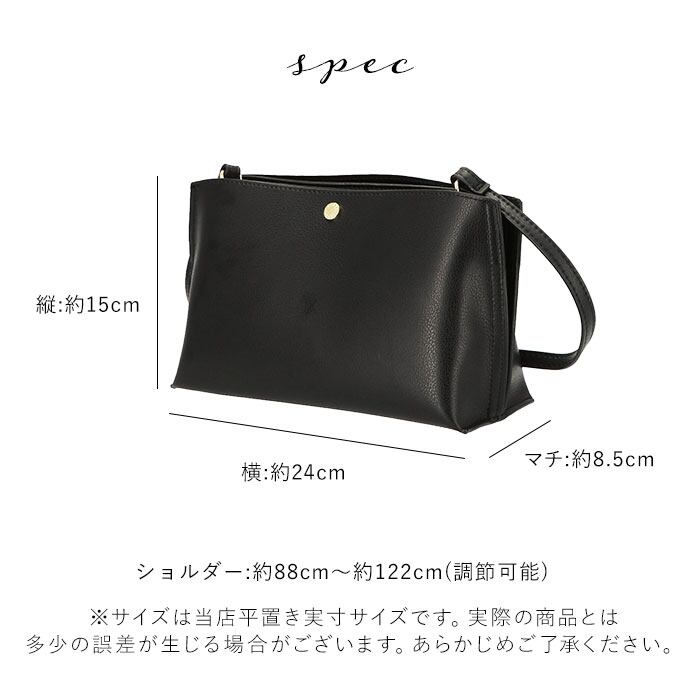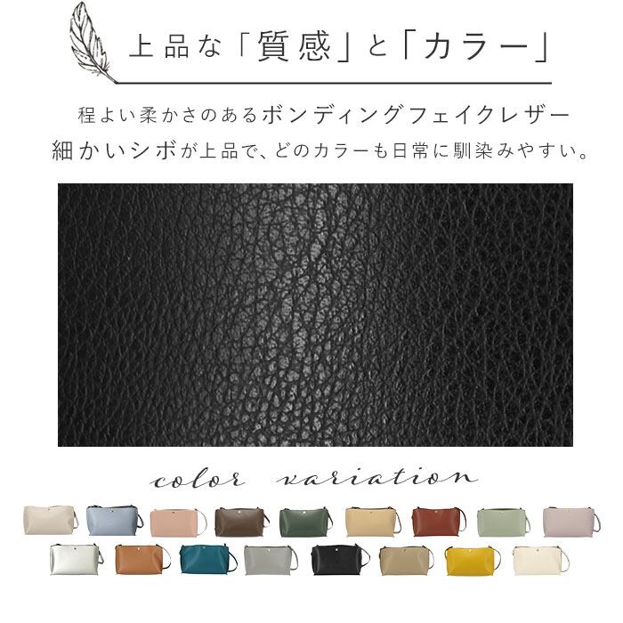 ・ほどよいシボ感のあるフェイクレザーと、単一カラーのシンプルなフォルム。メイン収納内側にも外側のカラーと同系色の裏生地を使用した落ち着いた色使いが魅力。