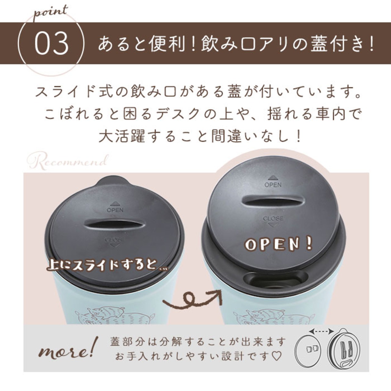 ※密閉構造ではありませんので、バッグに入れて持ち歩いたり横置きしないでください。また揺らしたり大きく傾けないでください。飲み物がもれ、火傷やものを汚す原因となります。