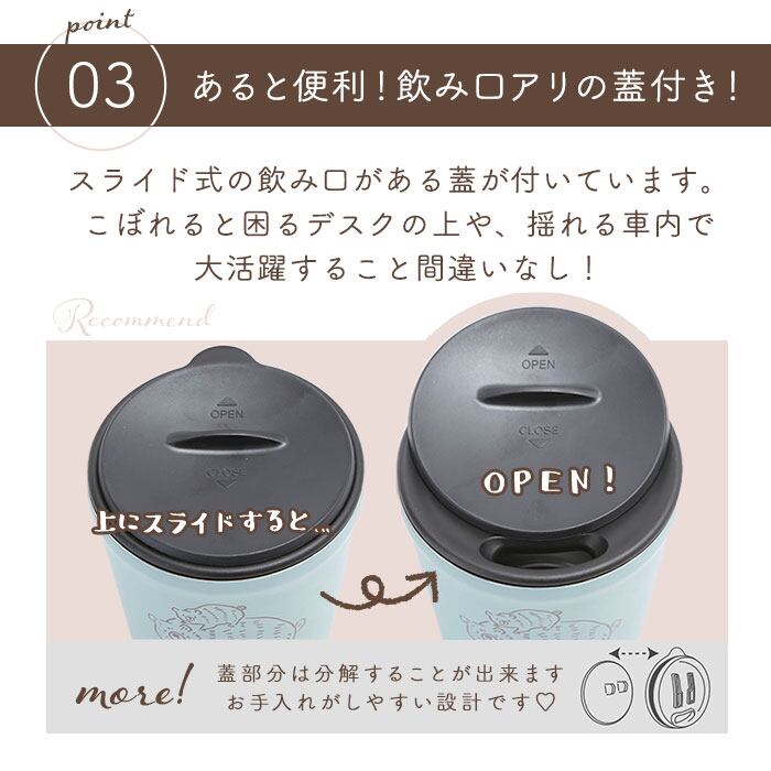 ・片手でスライドができる蓋付きだから、デスクの上でタンブラーを倒しても飲み物のこぼれ防止になる。