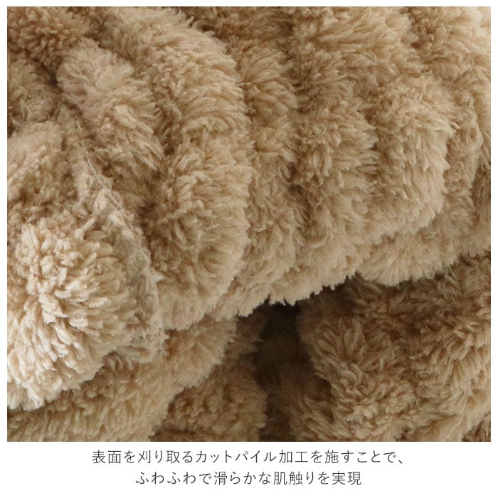 ・通常のタオル生地ではパイル状に織りあがっている生地に、キッズタオルキャップでは表面を刈り取るカットパイル加工を施すことで、ふわふわで滑らかな肌触りを実現。お子さまのデリケートな肌にも安心。