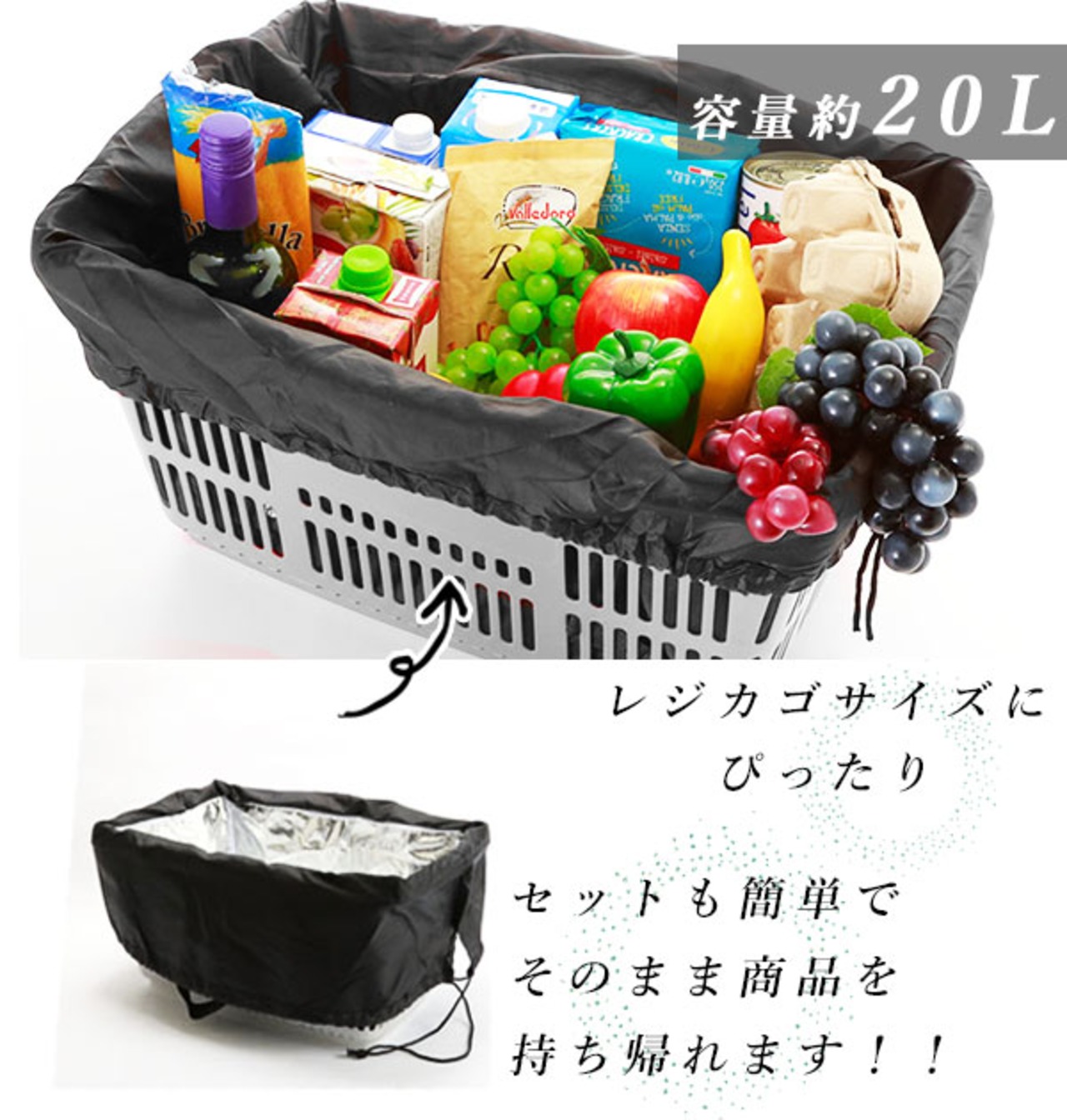 カゴから移し替える手間なし♪そのままお持ち帰り!アルミシートを内側に使用!保冷効果UP★スナップボタンで留めてコンパクトに!小さくたたんで大きく使える。レジかごにぴったりのジャンボパックです。