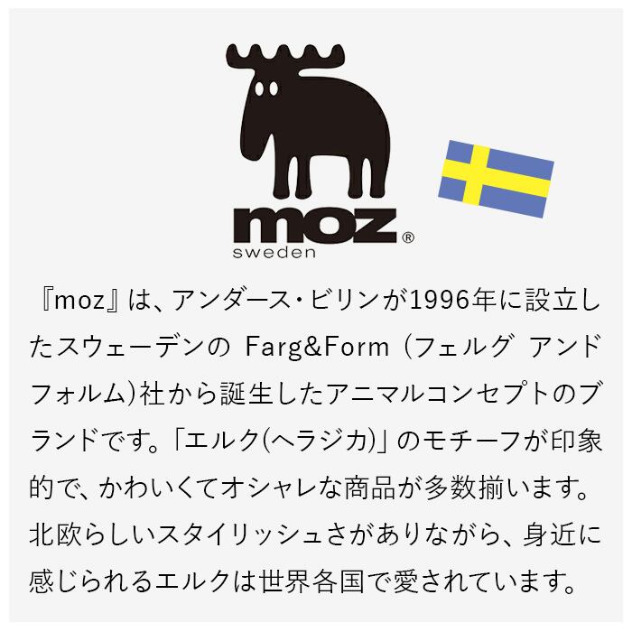・フロントに刺繍されたMOZのトレードマーク「エルク」(ヘラジカ)が愛らしいデザイン。背面のテキストはスウェーデン語で「僕はあなたのためにここにいるよ」という意味のメッセージ。