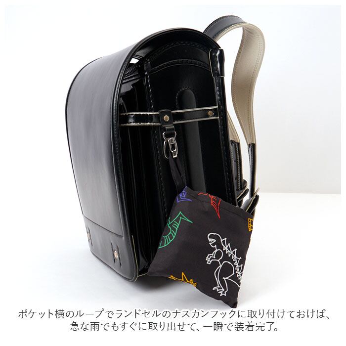 ・ポケット横のループでランドセルのナスカンフックに取り付けておけば、急な雨でもすぐに取り出せて、一瞬で装着完了。