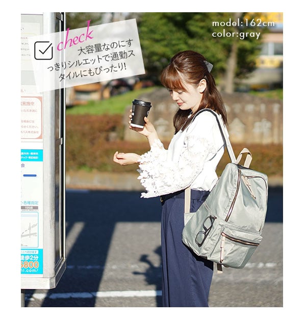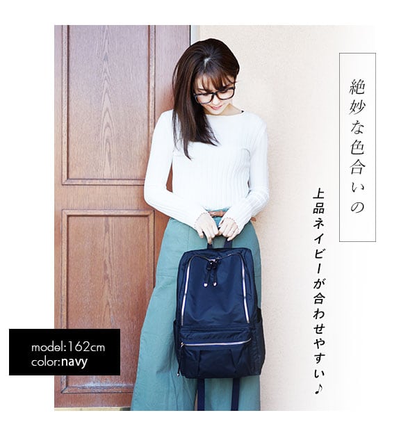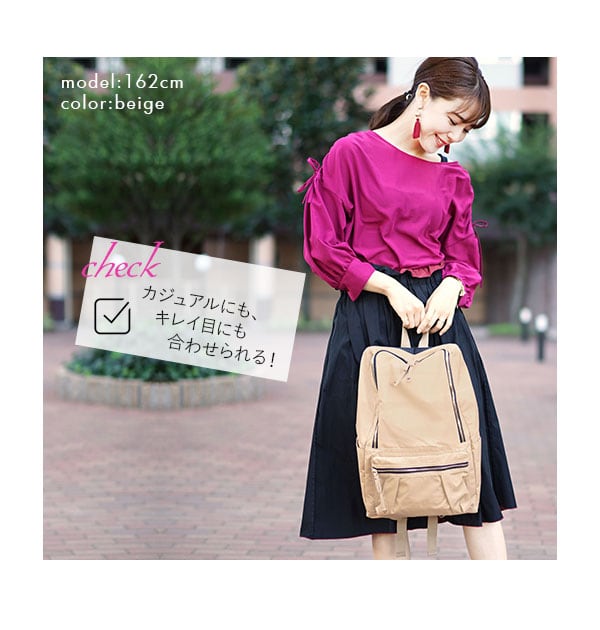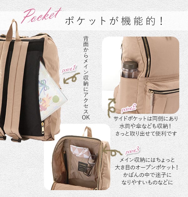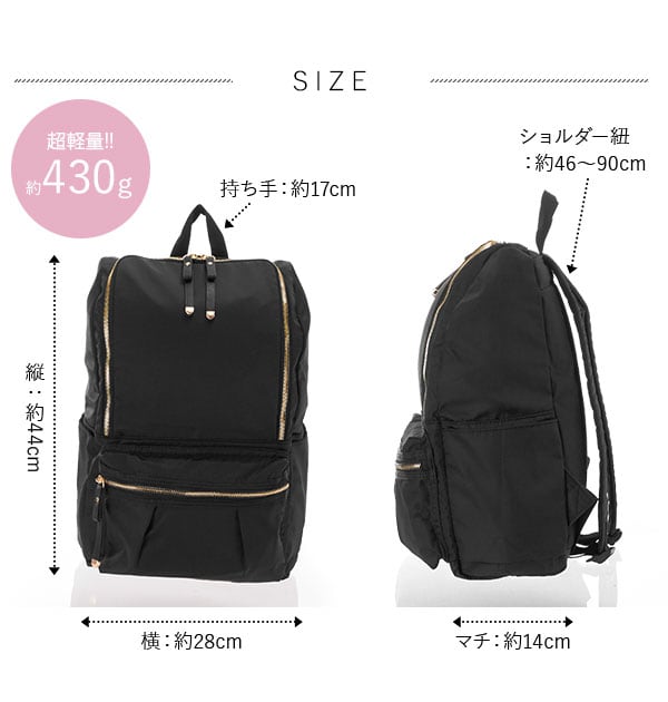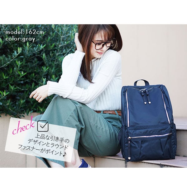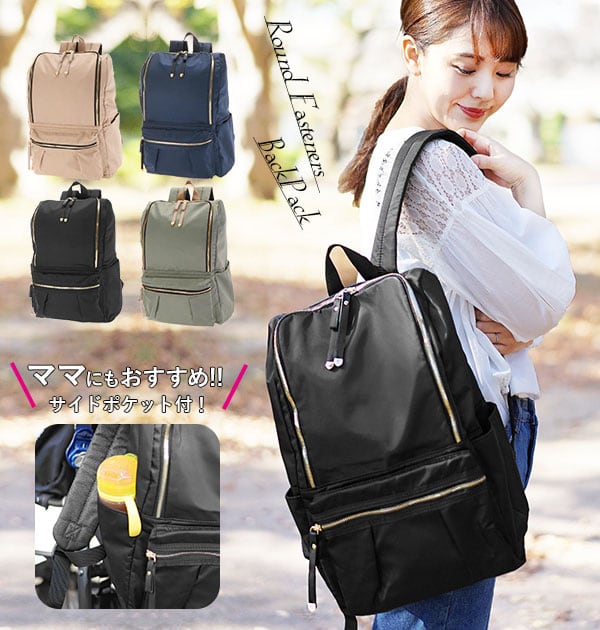 荷物が多いママにもおすすめ!軽量でサイドポケットが充実のラウンドファスナータイプのリュックです。口が大きく開くので中が見やすく、取り出しやすいのもポイントで、A4サイズはもちろん、小さめのノートパソコンも余裕で入る、見た目以上に大容量です。背面からメイン収納直結、背負いながらサイフなどが簡単に取り出せます。 サイドポケットは、水筒や傘、哺乳瓶などの収納に便利♪ ママだけでなく、通勤、通学と幅広く使えます。