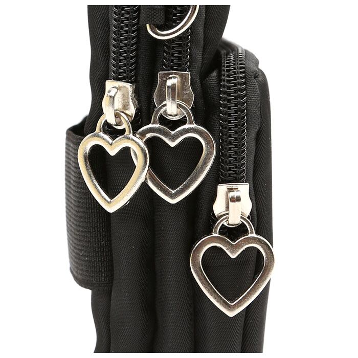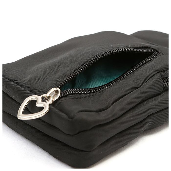 ・フロントにはリップクリームや鍵などを入れておけるファスナーポケット、パスケースなどを横から収納できるファスナーポケットを配置。