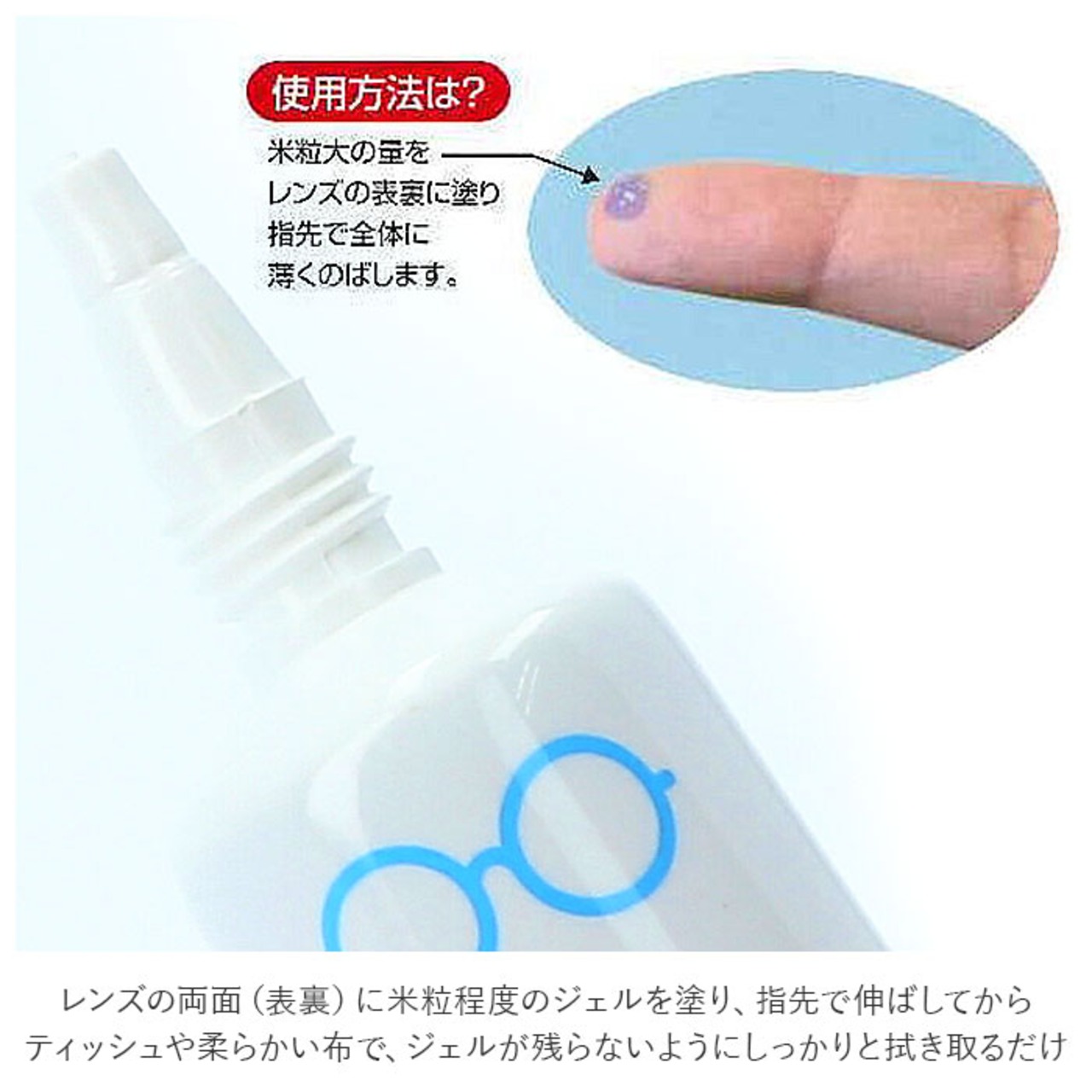 ・使い方は簡単!レンズの両面(表裏)に米粒程度のジェルを塗り、指先で伸ばしてからティッシュや柔らかい布で、ジェルが残らないようにしっかりと拭き取るだけ。(※メガネ拭きクロス・保湿成分を含んだティッシュペーパーは使用しないでください。)