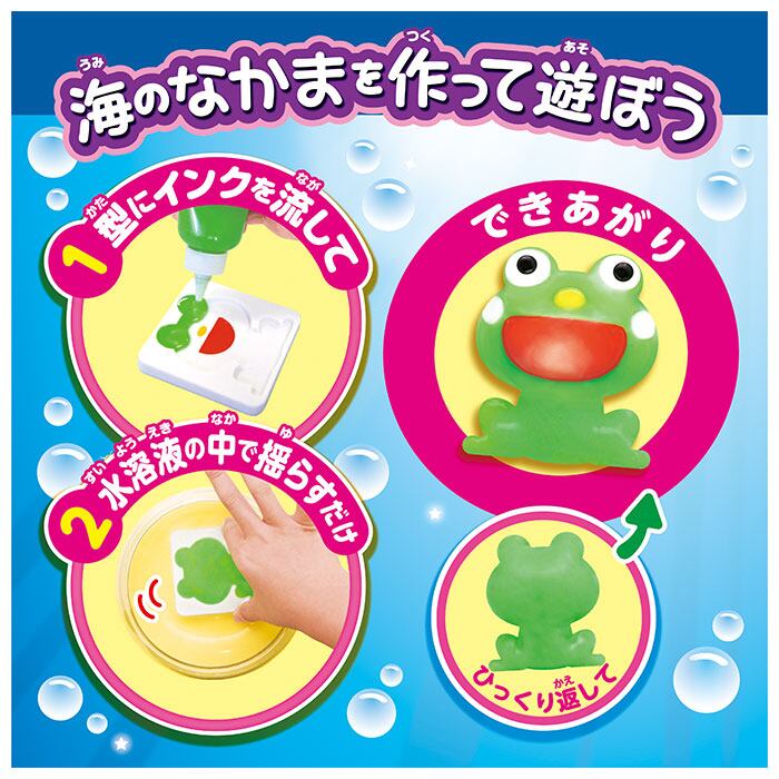 ・カラーインク11色・計12本、型(海のなかまたち)12種類、凝固パウダー6袋、ミニ水槽、遊び方ブック