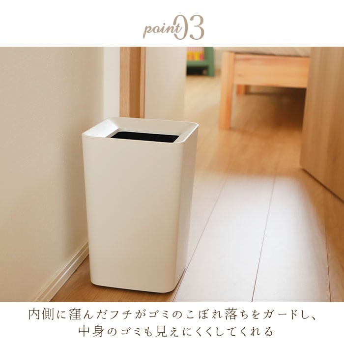 ・内側に窪んだフチがゴミのこぼれ落ちをガードし、中身のゴミも見えにくくしてくれる。