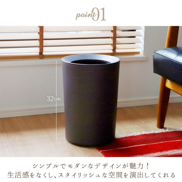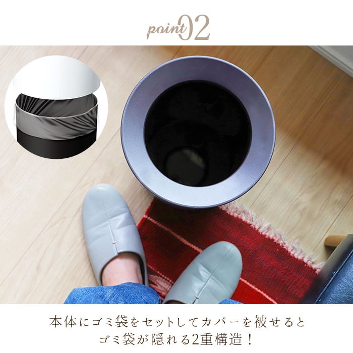 ・カバーを外し、本体にゴミ袋をセットしてカバーを被せるとゴミ袋が隠れる2重構造!生活感をなくし、スタイリッシュな空間を演出してくれる。