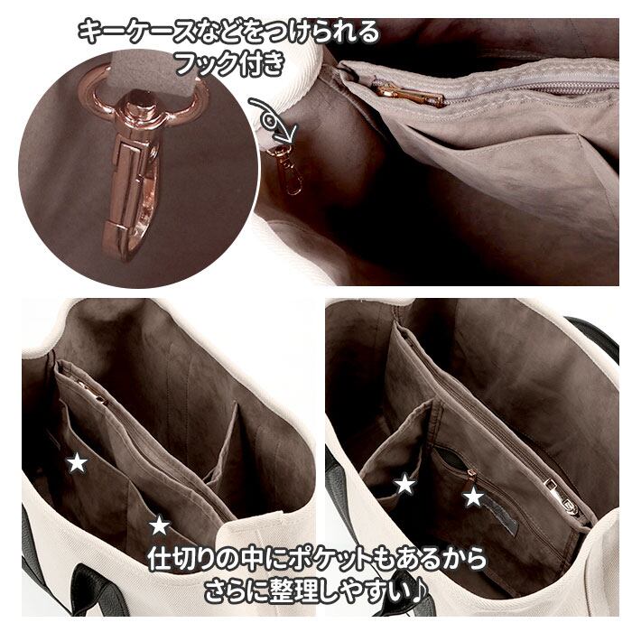 ・トート内側の生地はスエード調の高級感のある仕上がり。トート開口部には、キーケースをつなげて使えるフック付き。