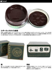 コロニル 1909シュプリーム クリームデラックスは、皮革への浸透力が高いシダーウッドオイルと、ラノリン等の天然オイルをブレンドしたクリームです。バランス良く保革・栄養効果、柔軟性を与えます。 皮革内部へゆきわたることで微細な皮革繊維に潤いを与え、深みのあるしっとりしたツヤが生まれます。フッ化炭素樹脂が撥水効果をもたらせます。コードバン、ブラッシュレザー(特殊研磨加工した革)にも効果的です。※有機溶剤は使用しておりません。