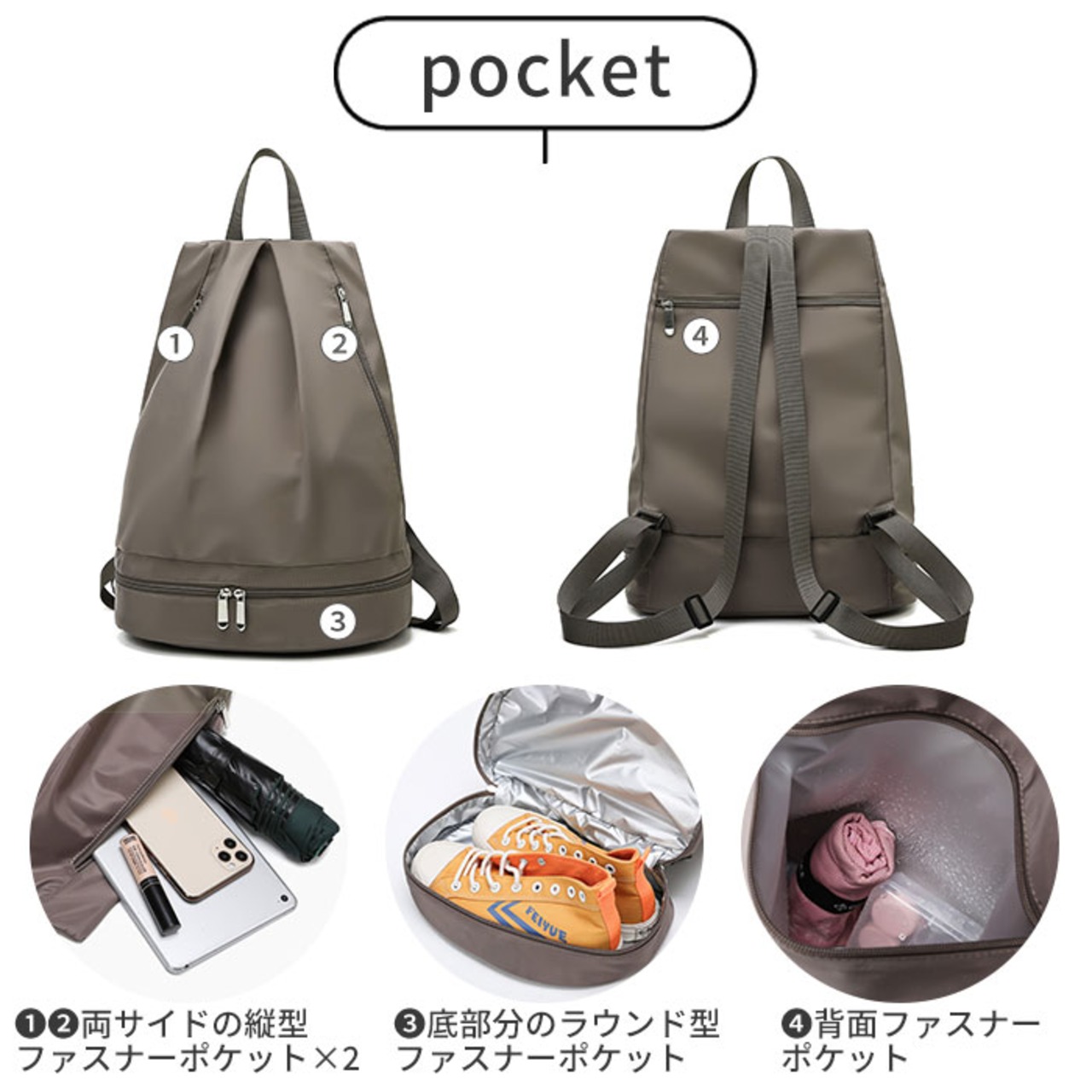 ・底部分のラウンド型ファスナーは、スニーカーやサンダルがラクラク収納できる立体ポケット。このリュック1つで、レジャーに必要な小物類がひとまとめに!