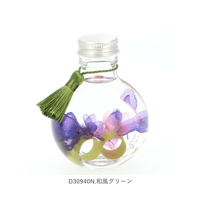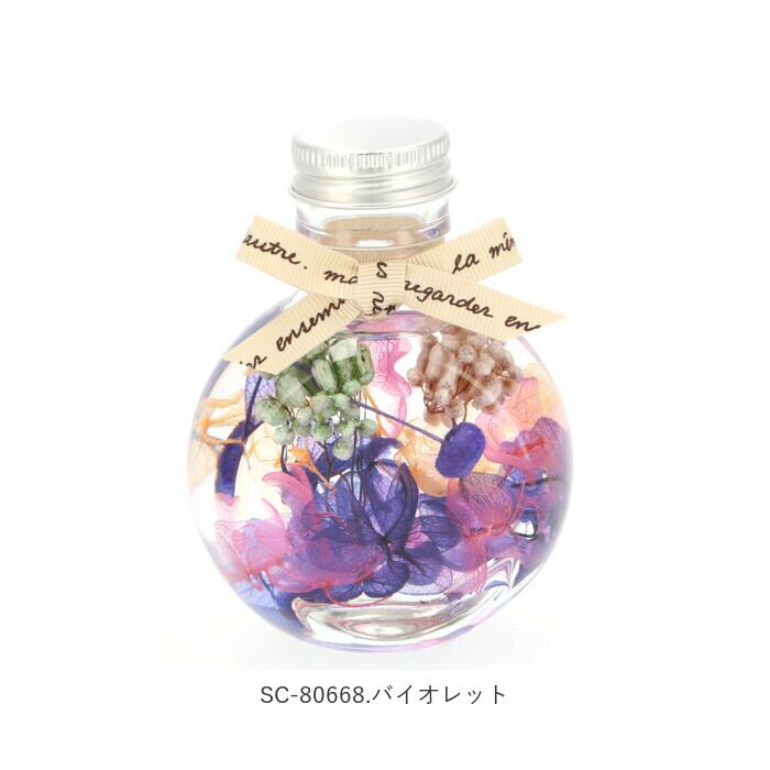 ・自然素材のプリザーブドフラワーやドライフラワーを使用し、保存用の専用オイルによってもたらされる独特の透明感や浮遊感に心が癒される…。※安全性を考慮して、花材の着色には食用染料を使用しているためオイルに色移りする場合がありますが、不良品ではありません。