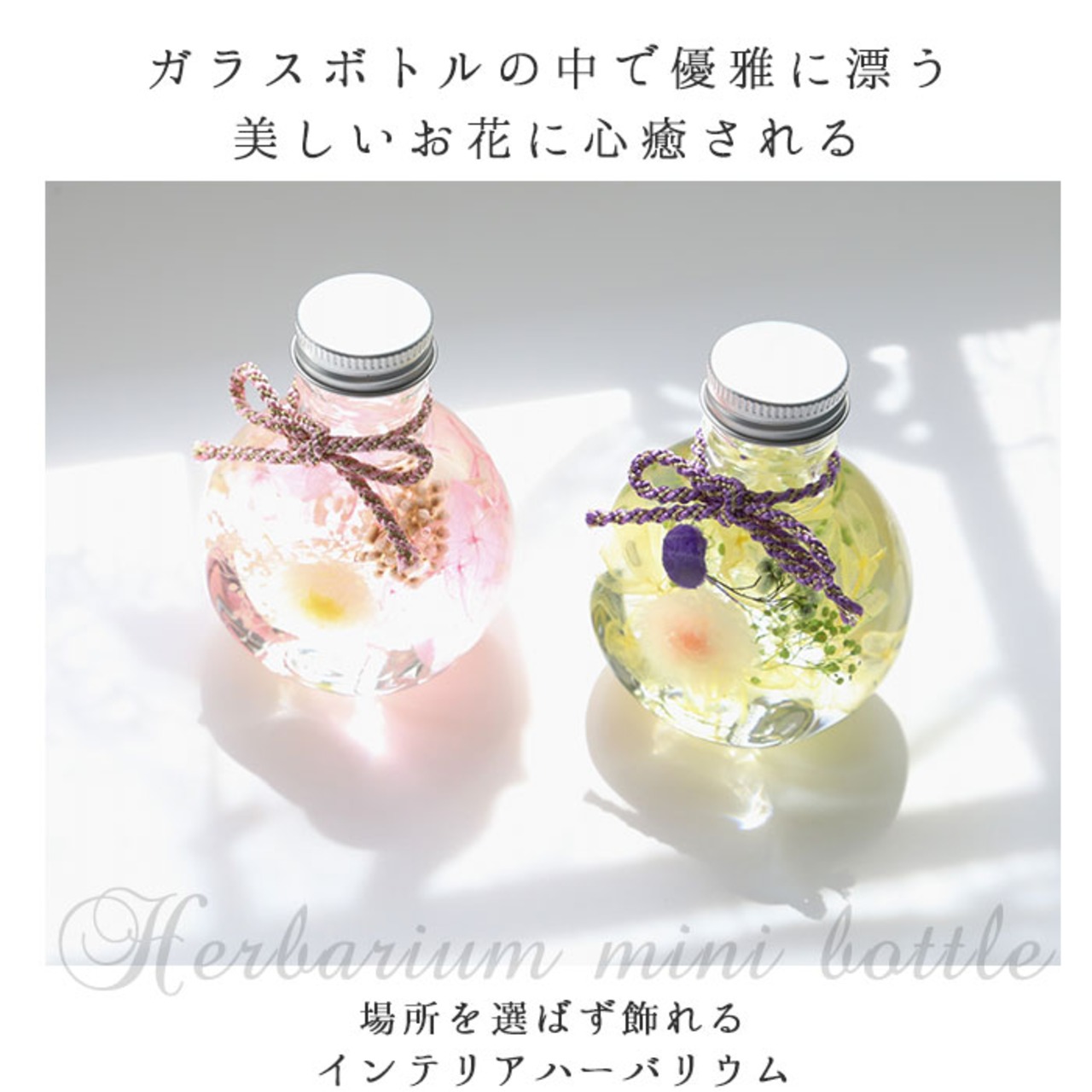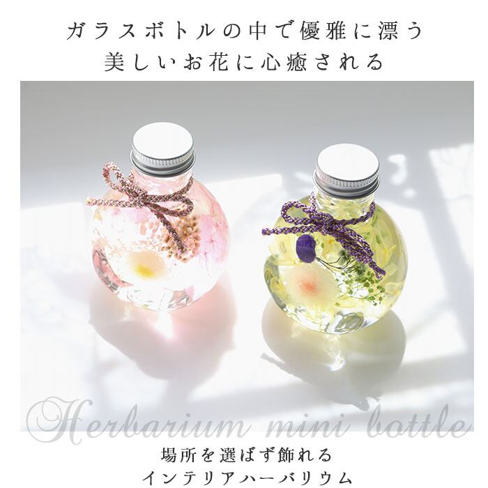 ・ガラスボトルの中で、優雅に漂う美しいお花に心癒されるインテリア・ハーバリウム。場所を選ばず飾れる、コンパクトなミニボトル。