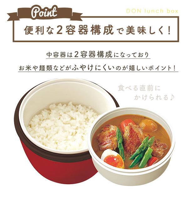 食べるときに具材をご飯にかけることができる2容器構成なので、ご飯が汁でふやけません。もちろん普通のお弁当容器としても使えます♪ステンレス真空断熱構造で温かさをしっかりキープ。保温ケースのフタのロックは自由な箇所で留められて便利です。