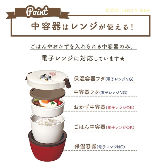 容器はフタを外せば電子レンジにも使えます☆食器洗い乾燥機でまるごと洗う事ができ、お手入れも簡単。(保温ケース除く) 便利でかわいいランチボックスです。