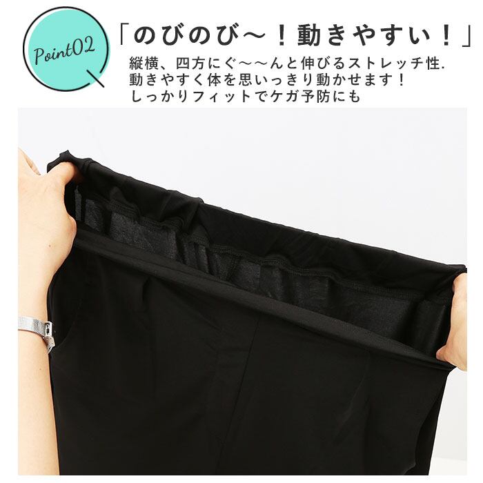 ・パンツは後ろゴム仕様で、締めつけ感なく履ける。左右にポケット付き。