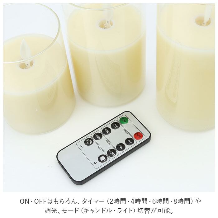 ・付属のリモコンでもON・OFFはもちろん、タイマー(2時間・4時間・6時間・8時間)や調光、モード(キャンドル・ライト)切替が可能。(※リモコンにはテスト用のボタン電池が付属しております。)