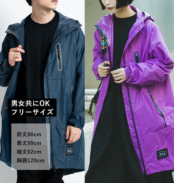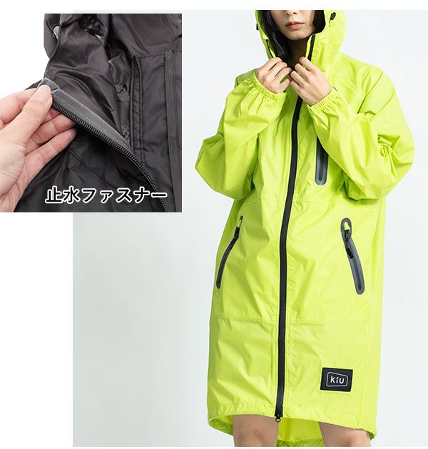 シンプルなジップアップタイプのレインコートです。ベーシックな落ち着いたカラーバリエーションで、男女共に着用可能なのも嬉しいフリーサイズ。生地の表面に、はっ水加工を施したポリエステル100%生地を使用し、裏面にもポリウレタンコーディング加工をすることではっ水効果を高めています。ジップファスナーには止水ファスナーを採用、さらに背中部分のメッシュ生地で透湿性を高めることで、悪天候の日でもより快適に着用できるよう工夫されています。通勤・通学はもちろん、自転車でのお子様の送り迎えなど、雨の多い時期もスマートに活躍できるアイテムです。