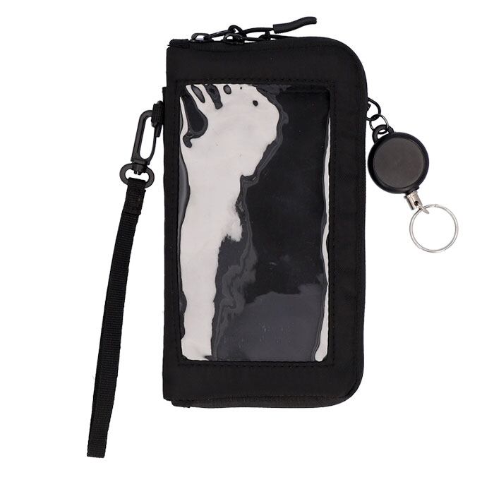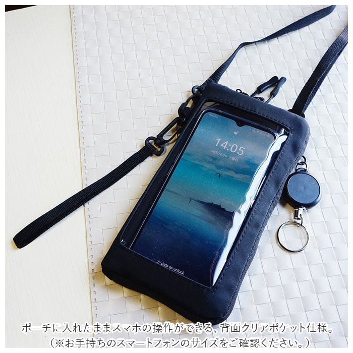 ・ポーチに入れたままスマホの操作ができる、背面クリアポケット仕様。(※お手持ちのスマートフォンのサイズをご確認ください。)