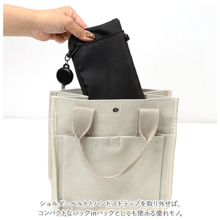 ・ショルダーベルトとハンドストラップを取り外せば、コンパクトなバッグinバッグとしても使える優れモノ。