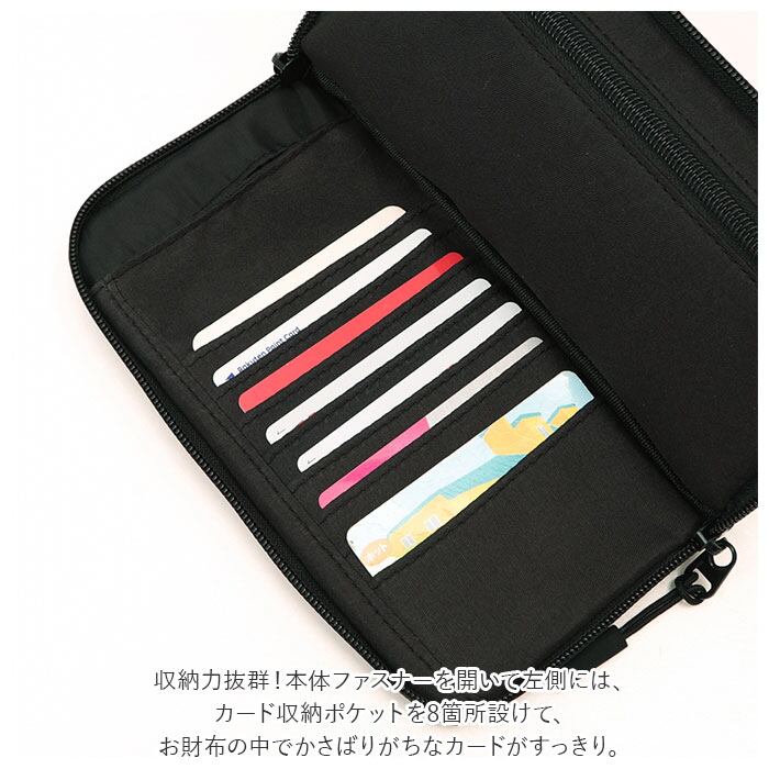 ・収納力抜群!本体ファスナーを開いて左側には、カード収納ポケットを8箇所設けて、お財布の中でかさばりがちなカードがすっきり。