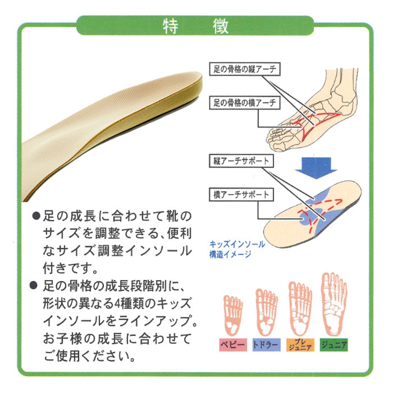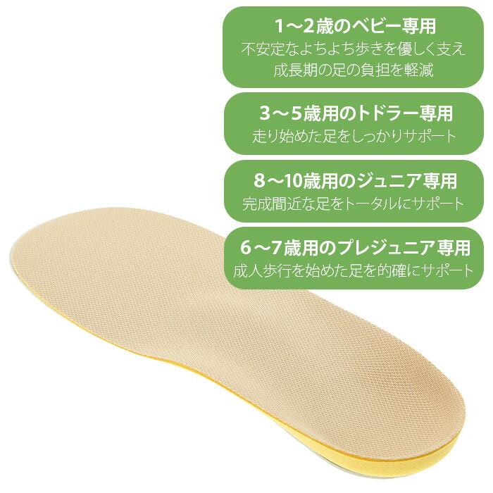 ・ベビー〜キッズ専用のインソール。お子様の発達する足骨格のアーチ構造をサポート。